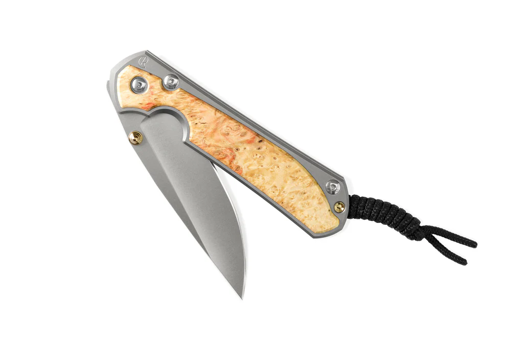האינליי הוא Box Elder Burl ולכן הדוגמה והמרקם משתנים בין יחידות – יתרון למי שרוצה סכין עם אופי ולא עוד אחת כמו כולם. זה בדיוק הסוג של פריט שמרגיש גם כלי וגם אסתטיקה.